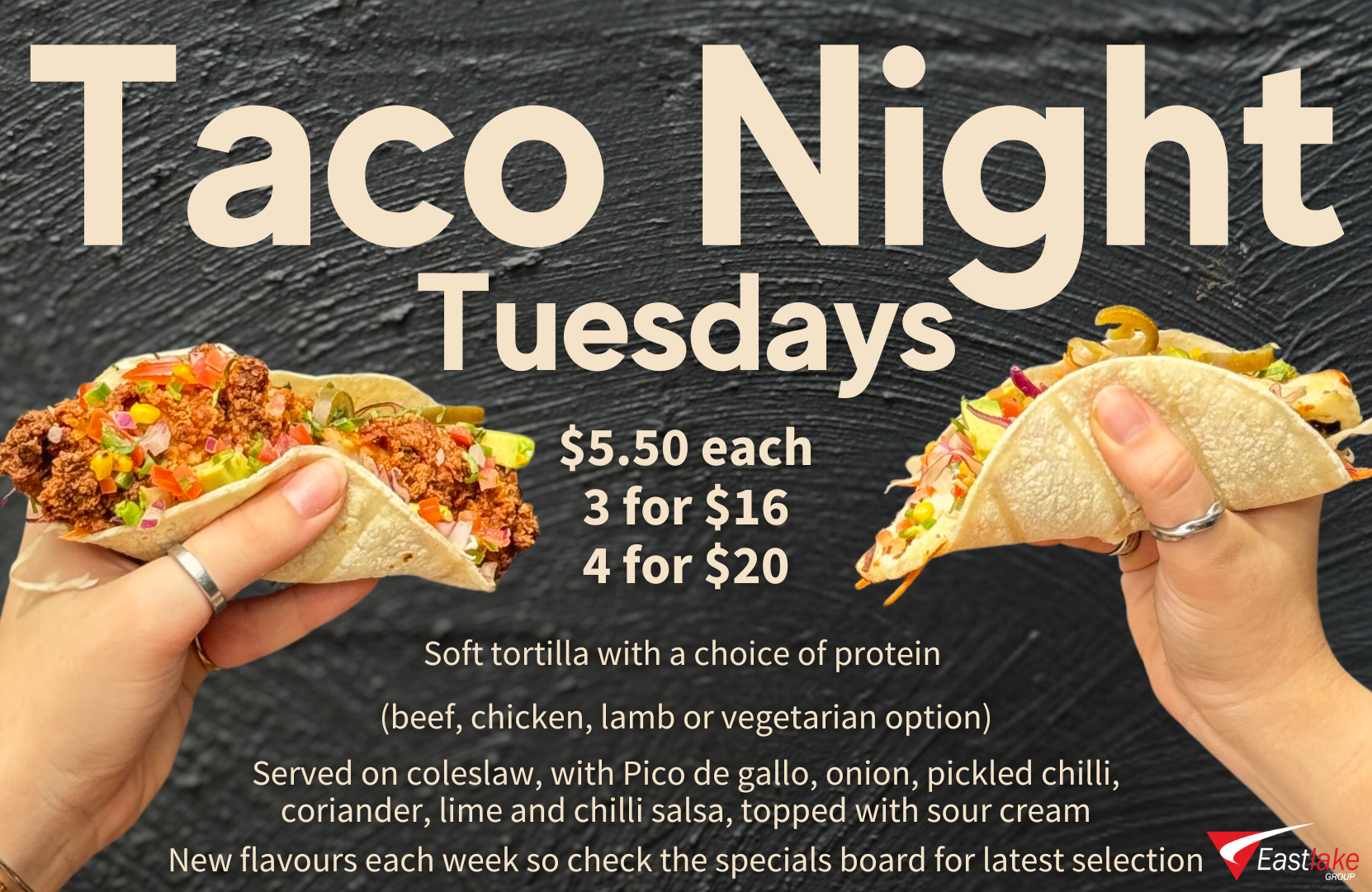 Served on coleslaw, with Pico de gallo, onion, pickled chilli, coriander, lime and chilli salsa, topped with sour cream